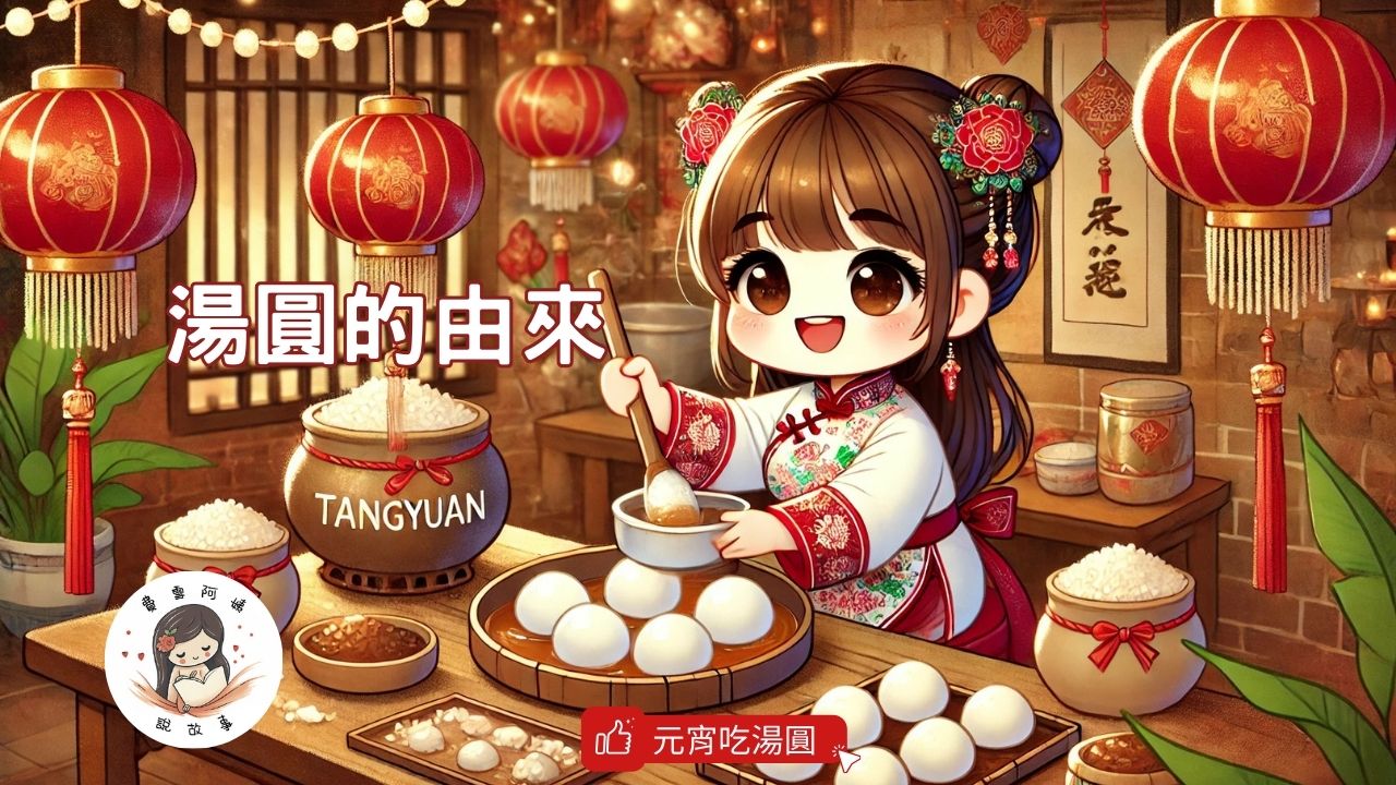 在一個寒冷的冬天,村子裡的人們因為天氣一直很灰暗而失去了笑容,也都不想出門了!善良的小圓希望人們可以重新連結在一塊,相互關懷,一起聊聊天,帶回溫暖!小圓想到了媽媽曾經說糯米粉可以作成暖胃的食物,再加上好吃的甜餡:黑芝麻、紅豆泥、花生果粒!小圓熱情又大方的邀請大家來品嘗。起初,村民們還不願意改觀,仍然不想出門⋯⋯但孩子們的笑聲吸引了所有人,讓村莊再次熱鬧起來。大家一邊吃湯圓,一邊點燈籠、猜燈謎,寒冷的冬天彷彿被趕走了。從此,每年的元宵節,村民們都會用湯圓團聚、用燈籠帶來希望,紀念這個溫暖又快樂的日子。